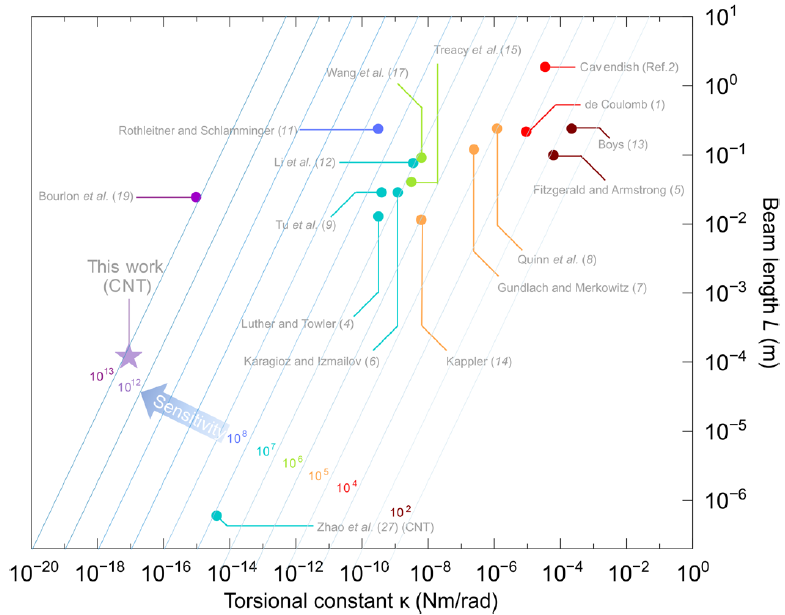 图 3 碳纳米管扭秤与经典扭秤的对比图。在对比悬丝扭转刚度和力臂长度的同时,也比较了由L/2k所定义的灵敏度。由浅至深的平行线表示灵敏度的数量级从2至13。灵敏度数量级相同的扭秤以相同颜色标记。