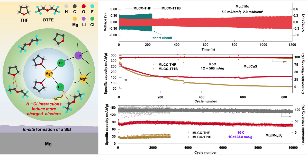 最近,清华大学张跃钢教授课题组设计引入双(2,2,2-三氟乙基)醚(BTFE)作为MLCC电解液的共溶剂,促进了带电离子团簇和固体电解质中间相(SEI)的生成,有效改善了电解液的离子电导率和镁金属负极的长循环稳定性。得益于BTFE共溶剂对电解液溶剂化结构和负极界面的调控,BTFE共溶的MLCC-1T1B电解液可以在20.0 mA/cm2的超高电流下可逆沉积-溶解镁。Mg//Mg电池在5.0 mA/cm2和15.0 mA/cm2电流密度下可分别循环1200 h和250 h,在电流密度、沉积容量以及循环寿命方面的性能显著优于目前报道的Mg//Mg对称电池。Mg//CuS全电池可循环800次,放电比容量高达160mAh/g;Mg//Mo6S8全电池可在80 C(1 C=128.8 mA/g)的超高倍率下工作10000次。这一研究工作提供了一种有效的溶剂化结构和界面调控策略,对推动镁二次电池的实用化具有重要意义。