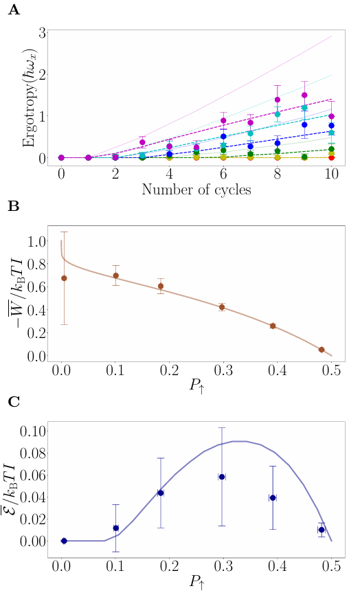 图 2 (A)量子电池的最大可提取功随循环次数的变化情况。不同颜色代表不同温度,与图 1保持一致。(B)信息到功的转换效率。(C)信息到最大可提取功的转换效率。实验中获得的最高效率为5.83%,在P↑=0.30时实现。
