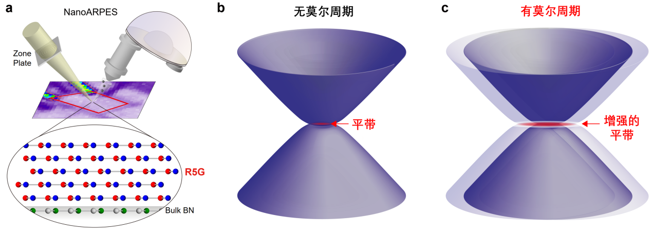 图1:菱方石墨烯中莫尔增强的平带电子结构。(a) NanoARPES及五层菱方石墨烯/氮化硼示意图。(b)无莫尔周期的五层菱方石墨烯电子结构示意图。(c)有莫尔周期的五层菱方石墨烯/氮化硼异质结电子结构示意图,红色箭头指向增强的平带。
