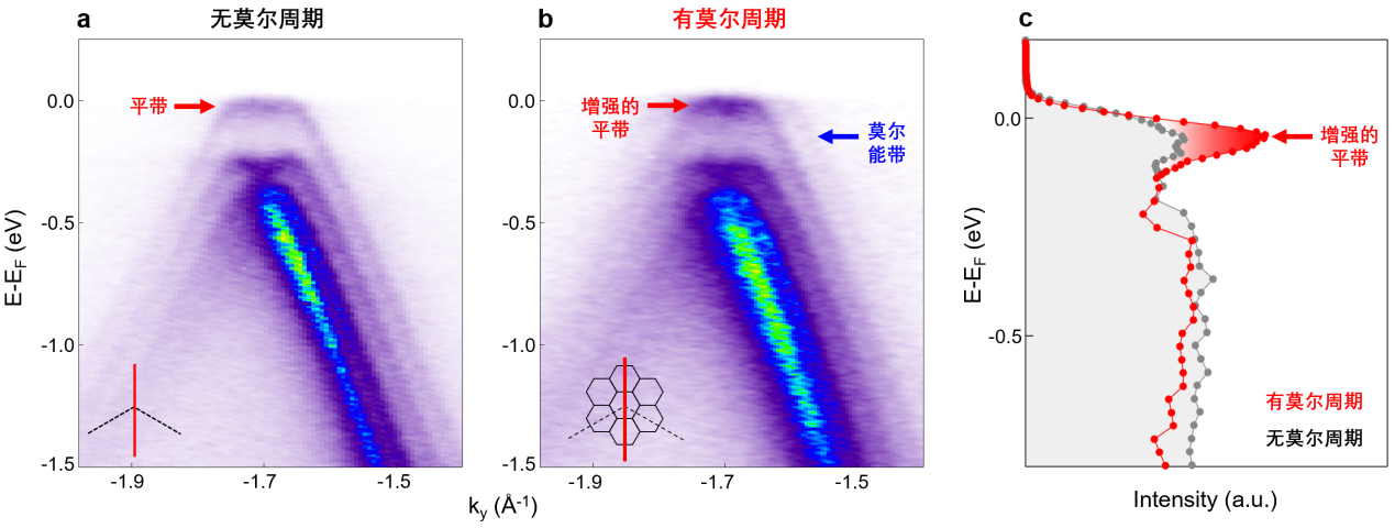 图2:五层菱方石墨烯异质结中莫尔增强的平带。(a)无莫尔周期五层菱方石墨烯的电子结构实验结果。(b)有莫尔周期五层菱方石墨烯的电子结构实验结果。红色箭头指向显著增强的平带,蓝色箭头指向复制的莫尔能带。(c) 切过平带附近的能量分布曲线,对比显示出有莫尔周期的菱方石墨烯中平带被显著增强(红色箭头)。
