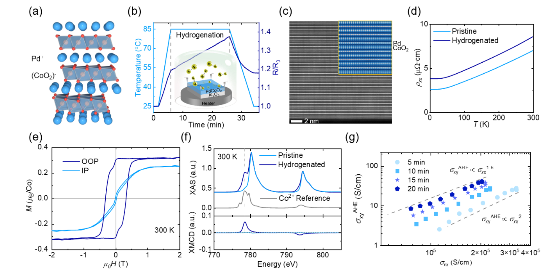 图a: PdCoO2的晶格结构示意图; b: 氢化实验示意图; c: 扫描透射电镜表征下的氢化PdCoO2; d: 氢化前后PdCoO2电阻率随温度变化曲线; e: 氢化PdCoO2室温下的磁化强度曲线; f: 氢化PdCoO2室温下的XAS和XMCD测量结果; g: 不同氢化时间下PdCoO2的反常霍尔电导率随纵向电导率的对数依赖