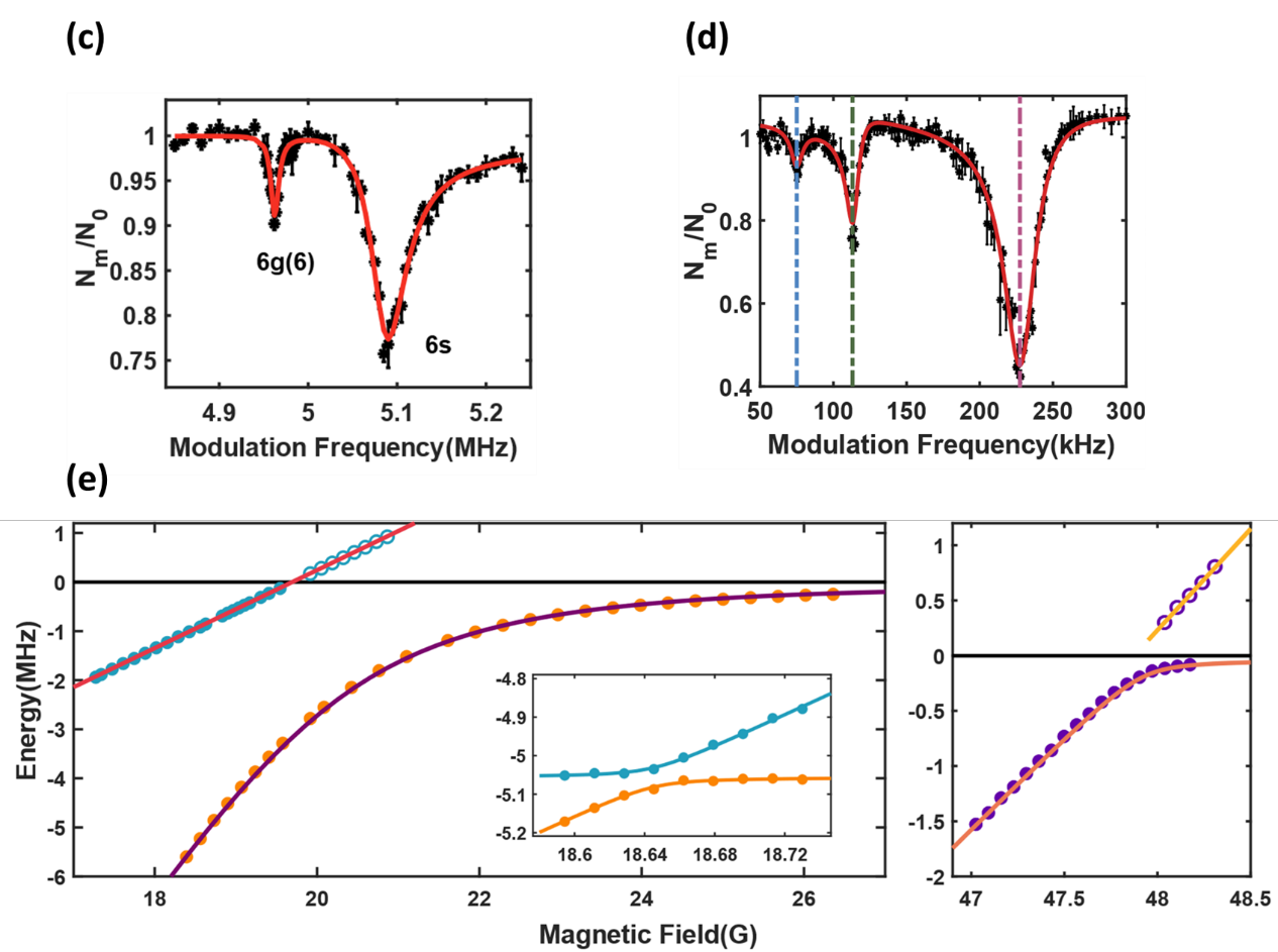 在实验中,133Cs原子两个碰撞态的能量差通过一束远失谐光的交流Stark效应来控制,能量差的调制则利用光强的调制实现。当光强的调制频率接近分子态结合能对应的整数阶共振频率时,调制诱导的共振便会引起光学势阱中的原子损失,从而在实验上被观测到。通常情况下原子损失极大值处的调制频率对应着一阶共振频率,但随着调制强度的增大和调制频率的减小,更高阶的调制共振信号也能被探测到,这对应着自由原子态吸收或放出多个调制量子而耦合到分子态的过程。这种光强调制的方法能够用来实验上探测Cs2分子态的能谱,包括原子散射阈值以下的束缚态和以上的准束缚态,以及分子态之间的回避交叉。对比磁场调制,光强调制可以探测更深的以及相应碰撞态能量差对磁场调节不敏感的分子。