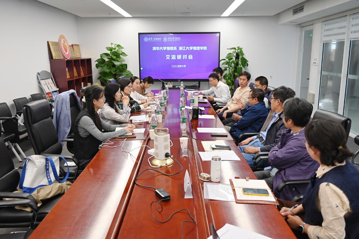 座谈伊始,肖志刚代表物理系对马晨华一行的到来表示热烈欢迎,马晨华对清华物理系的热情接待表示感谢,双方各自介绍了院系师资队伍、科研平台、人才培养、党建工作等方面基本情况。随后,马君雅详细介绍了浙大物理学院学生工作情况,包括本科生及研究生体量、人才培养、日常管理,导学思政等内容;胡震、刘永椿、杨晓旸介绍了物理系学生工作体系、工作力量,学生组织建设,导学关系构建,学生就业帮助,党建活动开展,理论学习及思政实践等工作开展情况。双方还重点聚焦党建与业务深度融合,引领事业高质量发展的机制举措;促进学生更高质量深造、更高质量就业的机制举措;落实研究生导师立德树人职责的机制举措和研究生导学思政建设情况;学科特色实践育人和学生活动开展情况;加强学生班集体建设及院系文化建设的经验举措等感兴趣的问题进行了深入探讨。