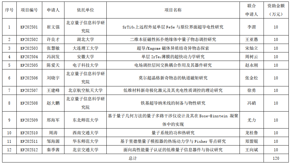 本年度开放基金共收到来自北京大学、北京量子信息科学研究院、大连理工大学等多所高校及科研院所的优秀项目申请。经实验室评审委员会严格评审与评议,最终确定对12项申请予以资助,资助总金额为人民币120万元。