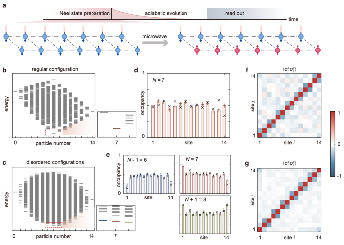 图 3: (a) 使用寻址激光完成多体初态的高保真度制备。(b, d, f) 规则晶格中的粒子激发和元胞内关联函数分布。(c, e, g) 无序晶格中的粒子激发和元胞间关联函数分布。