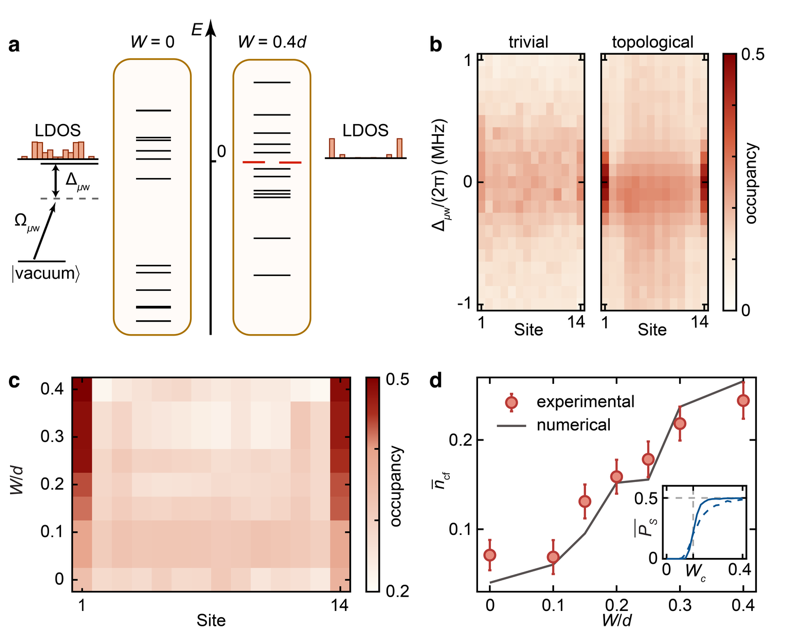 在单粒子层面上,研究团队利用微波波谱学技术(如图2),证实了无序诱导的拓扑相变过程。实验测量的单粒子激发谱显示,在规则晶格中,并不存在零能边缘态;然而,当系统引入结构无序后,原本拓扑平庸的阵列涌现出了统计简并的边缘态。测量结果进一步表明,随着无序度的增加,边缘格点的激发显著提升。这直观地证明了无序可以作为一种诱导剂,在体系中激发并稳定拓扑属性。