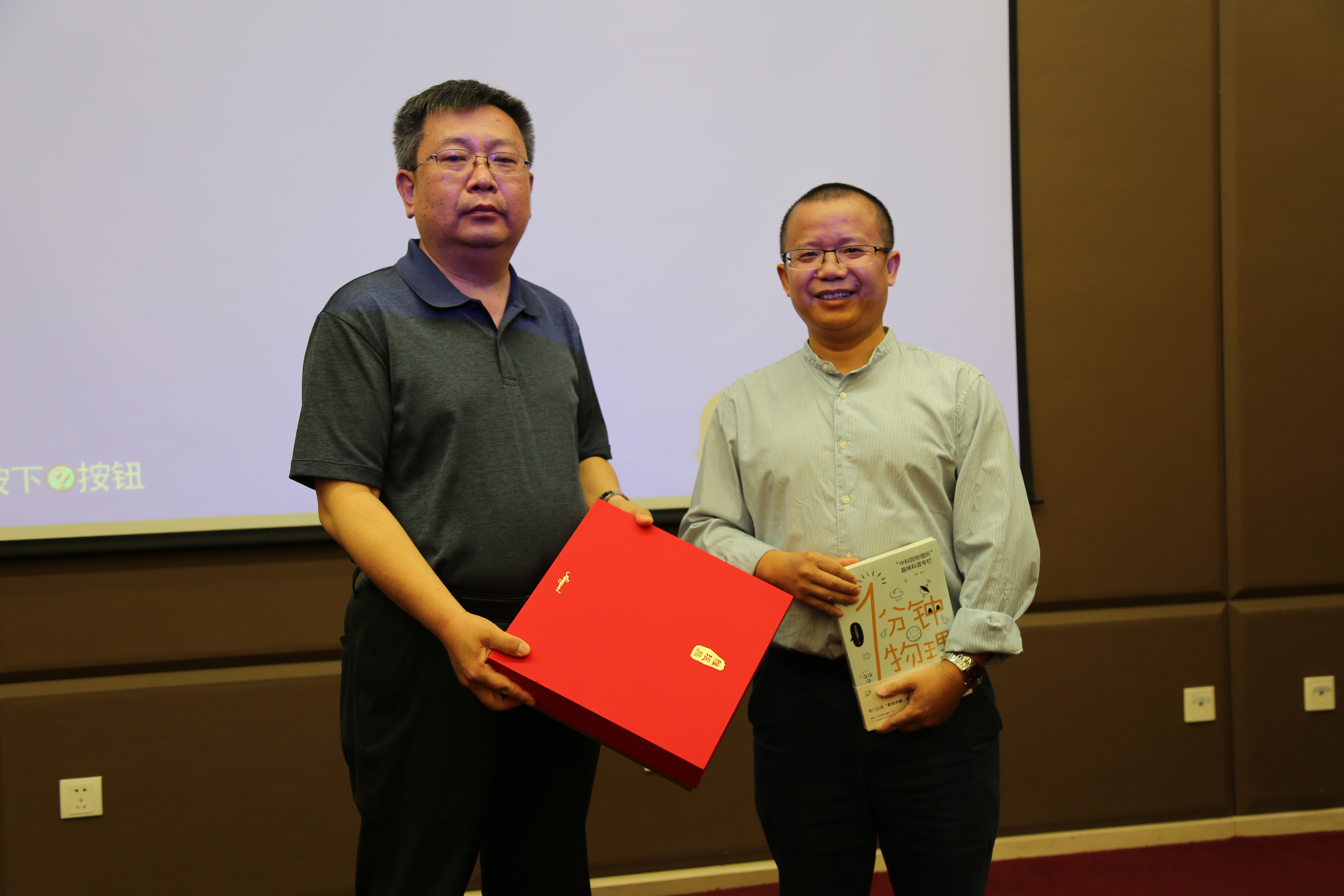 参观完所史展后,物理所在会议室举行了一个简短热情的欢迎仪式。顾长志副所长致辞表示欢迎,我系党委书记肖志刚老师致答辞表示感谢,互相赠送纪念品。两位领导都希望进一步加强院系和研究所的深度合作。