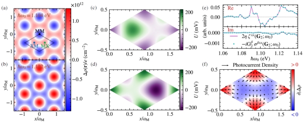 图2. tMoTe2在均匀线偏振光照下电荷分布的数值模拟结果。(a-b) 不同频率光照下电荷密度响应的空间分布;(c-d) 对应的莫尔周期静电势分布;(e-f) 光电流驱动电荷积累机制的数值验证。