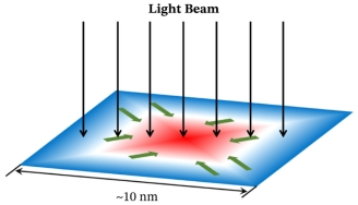 图1. 均匀光照导致莫尔超原胞内部非均匀电荷分布的示意图。绿色箭头表示均匀光照产生的非均匀直流光电流;红(蓝)色区域分别表示由光电流汇聚(发散)驱动的正(负)电荷积累区。