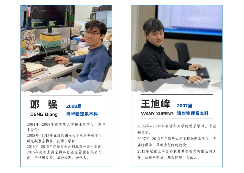 2026年,清华物理系将迎来建系100周年。百年来,一批批物理学子走向社会,在各行各业展现才华。值此百年系庆来临之际,物理系策划推出行业杰出校友系列访谈。近日,我们走进了金锝私募基金管理有限公司,与物理系校友王旭峰(2007届本科)与邓强(2008届本科)展开对话。从清华园的物理实验室,到量化金融的行业前沿,他们的成长足迹不仅勾勒出跨界探索的路径,也映射出清华物理人一以贯之的求真精神与奋进力量。
